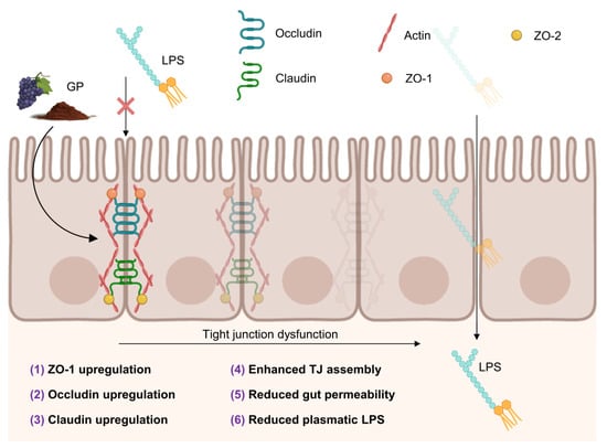 In recent years, there has been growing interest in how food-derived molecules, particularly (poly)phenols, affect the gut barrier by influencing the TJ and paracellular transport [92]. Numerous studies have investigated the effect of various grape-derived products on in vitro intestinal models such as Caco-2 cells or animal digestive tracts. These studies have demonstrated that grape-derived compounds can counteract permeabilization by studying paracellular flux (e.g., fluoroisothiocyanate-dextran (FITC-dextran)) or transepithelial electrical resistance (TEER) [93,94,95,96]. In our most recent research, we observed a decrease in paracellular transport of FITC-dextran after incubating Caco-2 monolayers with different GP-digested samples [97]. We also noted that GP-digested samples resulted in increased production of SCFAs and phenolic acids during colonic fermentation compared to control samples. This increase in SCFA and phenolic acid production may partially explain the observed decrease in permeabilization [97]. The mechanisms underlying the enhancement of the gut barrier exerted by GP are varied, including the upregulation of key genes encoding for diverse TJ proteins, such as occludins [83], claudins [83,85], ZO-1 [83,89], and TJ protein 1 [90]. Moreover, higher expression of the same proteins without variations in mRNA levels has also been reported [82,98]. Therefore, GP compounds may mediate a boost in intercellular unions through different routes than the transcription of TJ proteins, such as post-translational modifications required in TJ assembly and their association with the cytoskeleton [91] (Figure 5). However, the physiological impact of all these mechanisms is still difficult to assess.