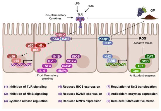 The intestinal lumen is continuously exposed to harmful stimuli that may cause oxidative stress, inflammation, and injury. Thus, reactive oxygen species (ROS) can damage cell membranes, disturb barrier integrity, and lead to enhanced intestinal permeability, inflammation, and endotoxemia [99]. The antioxidant and anti-inflammatory properties of grape/wine (poly)phenols are widely known [100] and can be expected to be evident in the GP. Similar behavior can be said for dietary fiber, whose intake has been associated, in general, with lower systemic inflammation [101]. In this review, among the multiple and complex signaling routes involved in inflammation and oxidative stress, we have focused on those concerning the nuclear factor κB (NF-κB) for inflammation and the nuclear factor erythroid 2-related factor 2 (Nrf2) for oxidative stress since their activation cascades are considerably susceptible to GP components (Figure 6).