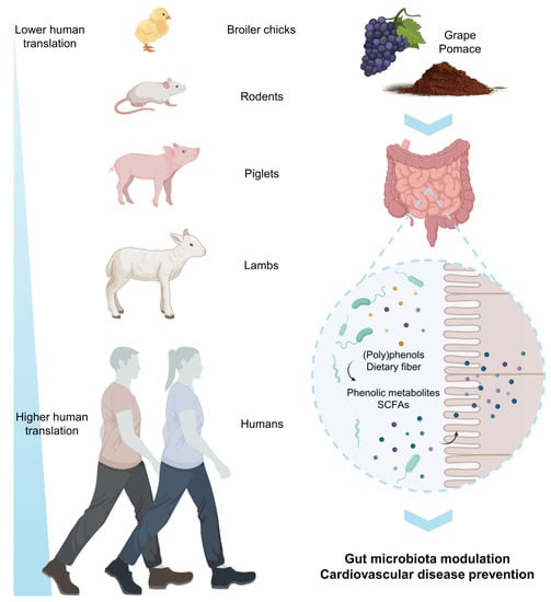 The first studies reporting GP’s effect on gut microbiota aimed to assess the possible application of (poly)phenols as alternatives to antibiotics in broiler chicken production [126]. These authors found that GP concentrates seemed to be effective in increasing the ileal populations of beneficial bacteria as well as markers of healthy gut morphology (Table 3). Recently, other researchers have found similar results, further corroborating that the inclusion of GP-derived products in the diet of broiler chickens favors intestinal health without affecting their blood biochemical and immune profiles [127] (Table 3).