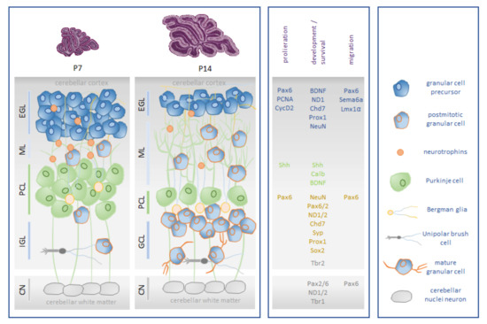 Schematic representation of rodent postnatal granular cell neurogenesis. (Box left): The major cell type in the cerebellar cortex is the granule cell (GC). Its precursors, the granular progenitor cells (GPCs), migrate to the external granular layer (EGL), which has high mitotic activity. From E15 until the third postnatal week, GCPs inside the EGL are mitotically active. Onset of differentiation of GCPs into mature GCs initiates around P5. They reach their final destination by radial migration along the Bergmann glia into the internal granular layer (IGL) over the molecular layer (ML) around P20. Unipolar brush cells (UBCs) are an interneuron subtype that are localized in the granule cell layer of the cerebellum. The cerebellar nuclei (CN) are the major initial structures of the cerebellum. In rodents, the proliferation of cerebellar interneurons and granule cells arising from the EGL continues for a period of roughly three weeks [17,27]. (Box middle): Cerebellar neurogenesis of granular cells is characterized by the expression of neuronal and proliferative markers and is orchestrated by neuronal transcription factors: brain-derived neurotrophic factor (BDNF), calbindin 1 (Calb1), chromodomain helicase DNA-binding protein 7 (Chd7), cyclin dependent kinase 2 (CycD2), LIM homeobox transcription factor 1 alpha (Lmx1α), neuronal differentiation 1/2 (NeuroD 1/2), neuronal nuclei (NeuN), paired box 2/6 (Pax2/Pax6), proliferating cell nuclear antigen (PCNA), prospero homeobox 1 (Prox1), semaphoring 6a (Sema6a), sonic hedgehog signaling molecule (Shh), sex-determining region Y-box 2 (Sox2), synaptophysin (Syp), and T-box brain transcription factor 1/2 (Tbr1/2). (Box right): Cellular players in cerebellar granular cell neurogenesis. Illustration adapted from [28].
