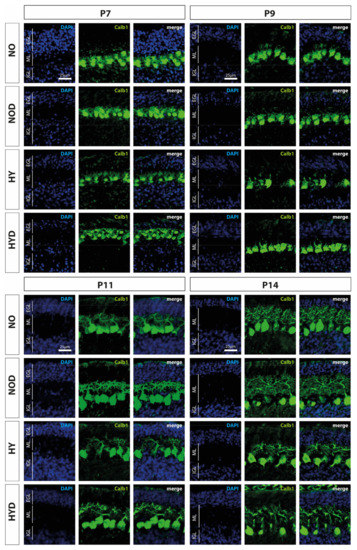 Representative cerebellar paraffin sections co-labeled with calbindin (Calb1, green) and DAPI (blue) of rat pups exposed to normoxia (NO) or hyperoxia (HY) compared to rat pups treated with dexmedetomidine (NOD, HYD). Analyses were conducted for the high oxygen (80%) and normoxia (21%) groups for postnatal day 7 (P7) after 24 h of oxygen exposure and after recovery in room air at P9, P11, and P14. The 24 h of hyperoxia exposure affected the density of Purkinje cells and depth of molecular layer in the newborn rat cerebellum at P7, and persisted until P9 or P11. Dexmedetomidine counteracted these changes. EGL, external granular layer; ML, molecular layer; IGL, internal granular layer. Scale bar 25 μm.