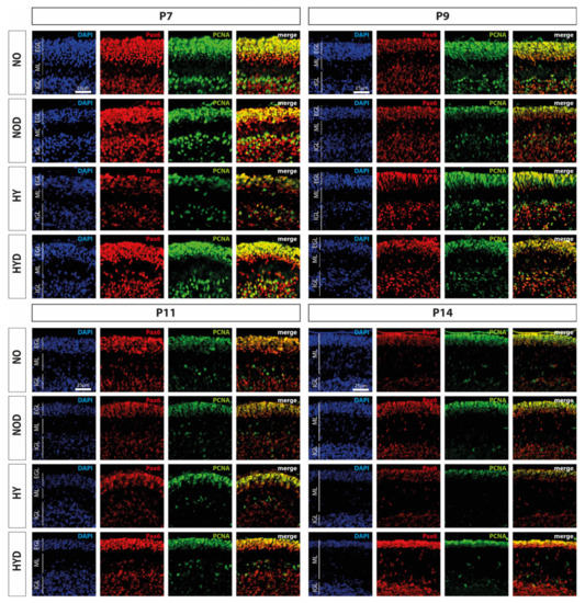 Representative cerebellar paraffin sections co-labeled with Pax6 (red), PCNA (green), and DAPI (blue) of rat pups exposed to normoxia (NO) or hyperoxia (HY) compared to rat pups treated with dexmedetomidine (NOD, HYD). Analyses were conducted for the high oxygen (80%) and normoxia (21%) groups for postnatal day 7 (P7) after 24 h of oxygen exposure and after recovery in room air at P9, P11, and P14. Acute hyperoxia for 1 day reduced granule cell density (Pax6), decreased proliferative capacity (PCNA), and altered EGL thickness in the cerebellum of newborn rats (P7). Dexmedetomidine was able to prevent these changes. EGL, external granular layer; ML, molecular layer; IGL, internal granular layer. Scale bar 25 μm.