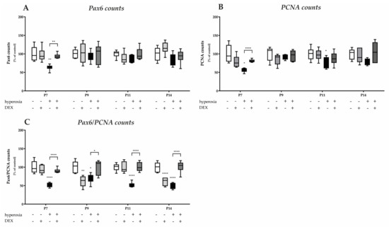 An important cerebellar developmental stage is the rapid proliferation of granule cell precursors. We firstly investigated the proportion of Pax6-expressing cells and the cerebellar proliferation capacity using the proportion of Pax6-positive cells and by means of the proliferation marker PCNA, and secondly, we examined the proportion of GPCs with regard to hyperoxia damage by proliferating Pax6 cells. We observed a marked reduction in Pax6- and PCNA-positive immunocytochemistry at P7, immediately after hyperoxic insult, compared with the control cerebellum, whereas DEX impressively abolished this downregulation (Figure 4). Indeed, Pax6 expression is dysregulated in the EGL at P7 of the developing cerebellum after high levels of oxygen (Figure 5A). This is consistent with a reduced proliferative capacity of the cerebellum at P7 and P11 (Figure 5B), although this effect was prevented by DEX only at P7 (Figure 5A,B). However, when the proportion of proliferating Pax6-positive GPCs is considered in comparison (Figure 5C), 24 h of hyperoxia resulted in a drastic reduction in dividing granular progenitor cells that persisted until P14 despite recovery. A single application of DEX completely prevented this sustained damage to GPC at the cellular level (Figure 5C). However, the effect of this single application of DEX without oxidative stress was also strikingly apparent, as the proportion of mitotic GPCs was equally sustainably reduced on the postnatal days 9 and 14, i.e., at least 2 days after potential damage (Figure 5C). The complete data are presented in Supplementary Table S2.