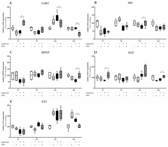 Neurotrophins regulate the survival and differentiation of different populations of cerebellar neurons during development. The gene expression of BDNF (Figure 6C) and NT3 (Figure 6E) significantly decreased after acute hyperoxia exposure at P7 and/or P14. DEX showed an expression-increasing effect for BDNF (Figure 6C) at P14 after reduction, as well as for NGF at P7 and P14 (Figure 6D). Hyperoxia reduced NT3 expression at P7, but increased it at P11 and P14 (Figure 6E). DEX had no effect on hyperoxia-induced neurotrophin expression, except at P14 (Figure 6C–E). DEX under ambient conditions showed identical expression patterns as under hyperoxic insult (Figure 6C–E). The complete data are presented in Supplementary Table S3.
