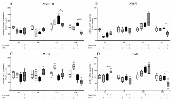 High oxygen exposure significantly reduced the transcription of NeuroD1 and NeuN at P7 and/or P9 (Figure 8A,B). Induced expression after hyperoxia occurred for NeuroD1, NeuN, and Chd7 at P11 (Figure 8A,B,D). DEX decreased the expression of NeuroD1 at P11, as well as of NeuN and Chd7 at P14 under hyperoxia, but not at the acute hyperoxia termination time at P7 (Figure 8A,B,D). Increased expression was achieved under hyperoxia with DEX for Prox1 at P9 (Figure 8C) and for Chd7 at P7 (Figure 8D). DEX under normoxia reduced the expression of NeuroD1 and NeuN at P7 and/or P9 (Figure 8A,B) and increased NeuroD1 and Prox1 at P11 (Figure 8C,D). The complete data are presented in Supplementary Table S5.