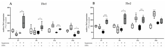Hyperoxia reduced both Tbr1 and Tbr2 mRNA expression at P7, and at P9 or P14 (Figure 10). Pretreatment with DEX before hyperoxia exposure resulted in a dramatic increase in expression, twofold above the control level, for Tbr1 and Tbr2 after acute hyperoxia as well as after recovery at room air to P14 (Figure 10). DEX under normoxia reduced Tbr1 at P7 (Figure 10A) and increased both Tbr1 and Tbr2 at P11 and P14 (Figure 10A,B). The complete data are presented in Supplementary Table S7.