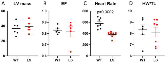 Echocardiographic measurement of (A) LV mass, (B) ejection fraction (%), (C) heart rate (bpm) in WT and Leigh Syndrome (LS, Ndufs4−/−) mice, and (D) heart weight normalized to tibia length (mg/mm); n = 5–9. No significant difference except for heart rate, p = 0.0002 by t-test.