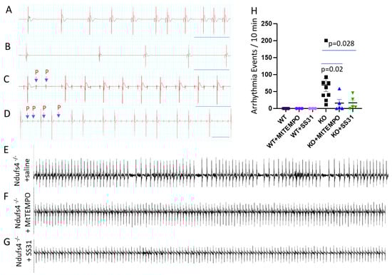 (A–D) The spectrum of bradyarrhythmia in Ndufs4−/− mice includes sinus node dysfunction (A), long sinus pauses (B), second degree AV block (C), and high-grade AV block (D). Arrows: non-conducted P waves; scale bar: 0.5 sec. (E–G). Representative ECG tracings show frequent bradyarrhythmic events in € saline treated Ndufs4−/− mice, relatively normal ECG in Ndufs4 −/− mice treated with (F) Mitotempo or (G) SS31 administered by subcutaneous osmotic pumps. (H) Quantitative analysis of in vivo arrhythmia events in Ndufs4−/− or WT mice treated with saline, Mitotempo, or SS31 between 45–50-days-of-age; n = 5–9. Scale bar: 0.5 s.
