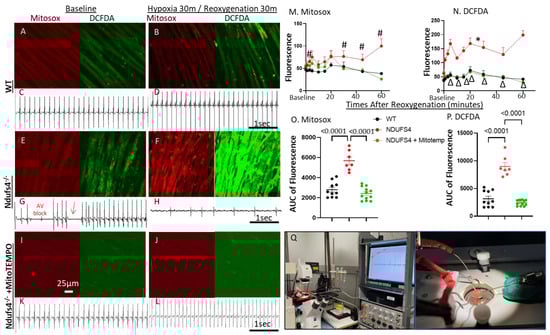 Confocal scanning of ex vivo Langendorff-perfused hearts loaded with Mitosox and DCFDA show increased ROS in Ndufs4−/− hearts (epicardial cardiomyocytes) (E) at baseline (E,M–P), which was substantially augmented after simulated hypoxia reoxygenation, H/R injury (F,M–P), when compared to WT heart (A,B). ROS is abolished by Mitotempo treatment (I,J). Simultaneous epicardial ECGs show sinus rhythm in WT heart (C,D), episodic AV block and sinus arrhythmia (arrow) in Ndufs4−/− hearts at baseline (G), and high-grade AV block (H) after reoxygenation, concomitant with dramatic increases in both Mitosox and DCF (F). (I–L) Mitotempo treatment abolished Mitosox and DCF and restored normal sinus rhythm. (M) Mitosox, (N) DCFDA fluorescence intensity after reoxygenation, (O) area under the curve of Mitosox fluorescence intensity, (P) area under the curve of DCFDA fluorescence intensity; n = 3; #, p < 0.05 Ndufs4 vs. both WT and Mitotempo; * p < 0.05 vs. WT; ∆ p < 0.05 Ndufs4 vs. Mitotempo for each time point. (Q) Photo of our ex vivo Langendorff perfused heart system, equipped with confocal microscopy for live imaging and simultaneous epicardial ECG recording. Right panel image shows the platform of microscope and epicardial leads.