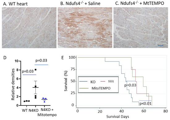 Representative immunohistochemistry (IHC) for 3-nitrotyrosine in (A) WT, (B) LS Ndufs4−/− heart, (C) Mitotempo-treated Ndufs4−/− hearts, (D) Analysis of relative densities of IHC; n = 3–4 for mouse left ventricles IHC by non-parametric tests. (E) Survival analysis shows significant lifespan extension in Ndufs4−/− mice treated with either SS31 (red) or Mitotempo (green) compared with saline-treated Ndufs4KO mice (blue); n = 4–11, by log-rank tests. Scale bar: 50 µm.