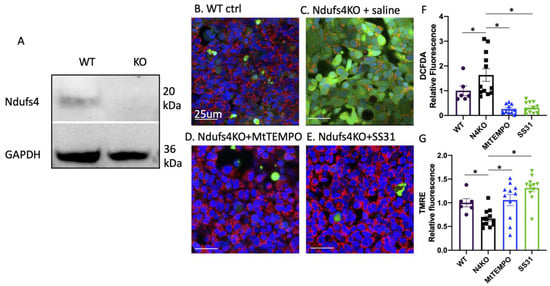 (A) Western blot of WT-HEK293 cells and Ndufs4 KO- cells. Live confocal imaging of Ndufs4-deleted HEK293 (C–E) and control cells (B) loaded with TMRE and DCFDA shows increased ROS (green, DCFDA) and decreased TMRE (loss of red) in Ndufs4-deleted cells (C). Treatment with (D) Mitotempo or (E) SS31 restored TMRE and ROS (F,G); n = 6–12 for cells; * p < 0.05 by ANOVA and post hoc analysis.