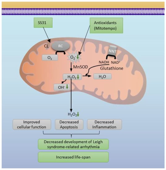 The current study aims to elucidate the mechanistic role of oxidative stress in bradyarrhythmia in mitochondrial cardiomyopathy using mice with a germline deletion of a mitochondrial complex I subunit, Ndufs4, resembling Leigh Syndrome (LS) [10]. LS is a phenotypically and genetically heterogeneous mitochondrial disease commonly presented with psychomotor regression and early mortality [11]. The most common causes are mutations in components of mitochondrial respiratory complex I [11], NADH dehydrogenase. The cardiomyopathic phenotypes of these LS mice with complex I deficiency include bradycardia due to a sinus node dysfunction and conduction defect. In this study, we showed that treatment with various mitochondrial-targeted antioxidants attenuated ROS and restored normal sinus rhythm in parallel with an improved mitochondrial membrane potential, less oxidative damage, and extension of lifespan.
