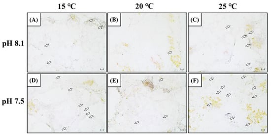 SOD mRNA expression in the hepatopancreas of H. discus hannai detected by in situ hybridization on day 5 (A–F). (A) pH 8.1 and 15 °C group; (B) pH 8.1 and 20 °C group; (C) pH 8.1 and 25 °C group; (D) pH 7.5 and 15 °C group; (E) pH 7.5 and 20 °C group; and (F) pH 7.5 and 25 °C group. Dark areas (white arrow) indicate the mRNA expression of SOD in the hepatopancreas. Scale bar = 25 μm.