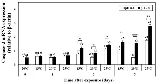 Changes in the mRNA expression of caspase-3 in the hepatopancreas of H. discus hannai exposed to different pH and temperature conditions for 5 days. Different letters indicate significant differences among abalone groups exposed to the same temperature and pH for different times (p < 0.05). Numbers indicate significant differences among different temperatures for the same exposure time and pH level (p < 0.05). The symbol “*” indicates a significant difference in caspase-3 mRNA expression between pH levels at the same temperature and time point (*, p < 0.05; **, p < 0.01, and ***, p < 0.001). All values represent the mean ± standard error (n = 3).
