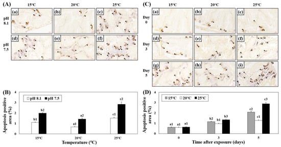 Images from the TUNEL assay of the hepatopancreatic tissue of H. discus hannai exposed to different pH and temperature conditions for the same exposure time (A,C). (A): (a) pH 8.1 and 15 °C; (b) pH 8.1 and 20 °C (control); (c) pH 8.1 and 25 °C; (d) pH 7.5 and 15 °C; (e) pH 7.5 and 20 °C; and (f) pH 7.5 and 25 °C on day 5. (C): [(a) pH 7.5, 15 °C; (b) pH 7.5, 20 °C; (c) pH 7.5, 25 °C on day 0]; ((d) pH 7.5, 15 °C; (e) pH 7.5, 20 °C; (f) pH 7.5, 25 °C on day 3); ((g) pH 7.5, 15 °C; (h) pH 7.5, 20 °C; and (i) pH 7.5, 25 °C on day 5). Black arrows (brown cells) indicate the apoptotic area. Scale bars = 60 μm. (B) Degree of apoptosis-positive area (%) in (A), and (D) Degree of apoptosis-positive area (%) in (C). Different characteristics in (B) indicate values corresponding to different temperatures within the same pH level, and the numbers in (B) indicate significant differences among different pH values at the same temperature (p < 0.05). Different letters in (D) indicate values corresponding to different exposure times for the same temperature, and numbers in (D) indicate significant differences among different temperatures within the same exposure times (p < 0.05). All values are presented as the mean ± standard error (n = 3).