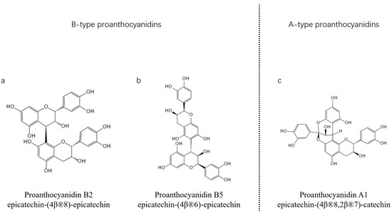 General molecular structure of oligomeric A-type and B-type proanthocyanidins ((a) proanthocyanidin B2, (b) proanthocyanidin B5, (c) proanthocyanidin A1).