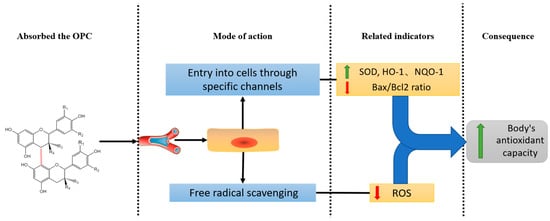 OPCs can enhance the expression of antioxidant enzymes and increase the antioxidant capacity of the body through pathways, such as in the MAPK pathway, adjusting the NF-κB pathway to enhance the expression of antioxidant enzymes [87], induction of Nrf2 expression to activate HO-1 and NQO-1 to increase the body’s antioxidant capacity and decrease the expression of apoptosis-related genes, such as Bax: Bcl2 ratio to protect cells (Figure 4). OPCs showed a higher free radical scavenging ability than highly polymeric proanthocyanidins; the principle is that the H+ released from the polyhydroxy groups of OPCs combines with free radicals to achieve oxidation by preventing the reaction between free radicals and biomacromolecules, thus reducing the concentration of free radicals to protect the cells [88,89,90]. This antioxidant capacity of OPCs can be possibly used in several ways, such as CVD, DM, anti-inflammatory, and anti-aging [91]. The above findings showed that OPCs have a certain antioxidant capacity and can be widely applied in many fields.