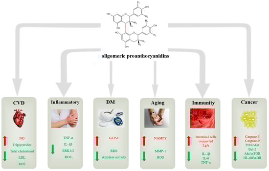OPCs have preventive and treatment effects on DM, especially diabetes mellitus type 2 (T2DM); For example, the inhibition of α-glucosidase by OPCs can effectively prevent hyperglycemia, and the inhibition of the enzyme is reversible [135]. Hyperglycemia is one of the most important features of diabetes, and the OPCs also have the capacity to reduce this symptom. Moreover, it has been reported that OPCs can significantly enhance the hypoglycemic effect of berberine in diabetic db/db mice [136]. One of the principles for this capacity is that it can increase the number of the mucin-secreting goblet cells in the intestine, affects glucose transport proteins in the intestine, stimulates the secretion of corresponding hormones, such as glucagon-like peptide-1 (GLP-1), and also regulates the flora in the intestine, increasing the number of beneficial bacteria [137]. Another principle showed that OPCs inhibit the binding of starch and amylase in the intestine. For different starch, such as digestible starch (RDS), slowly digestible starch (SDS), and resistant starch (RS) OPCs have different effects, it can reduce RDS content which can rapidly raise blood sugar, and it can form grape seed proanthocyanidins–potato (GSP–potato) which can slow down the breakdown of starch by amylase, it also inhibits the activity of amylase to lower blood sugar [138].