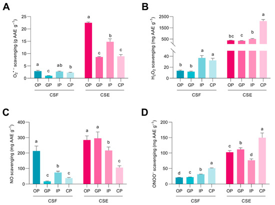 Radical scavenging capacity of the digested fractions from the cocoa shell flour (CSF) and the cocoa shell extract (CSE) for superoxide anion (O2•−) (A), hydrogen peroxide (H2O2) (B), nitric oxide (NO•) (C), and peroxynitrite (ONOO−) (D). OP—oral phase; GP—gastric phase; IP—intestinal phase; CP—colonic phase. Bars with different letters denote significant differences between the digested phases of the CSF or the CSE according to ANOVA and Tukey’s multiple range test (p < 0.05).