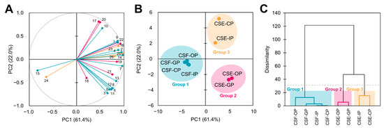 Principal component analysis (A,B). Agglomerative hierarchical cluster analysis (C) illustrating the behavior of phenolic compounds and methylxanthines from the cocoa shell during simulated gastrointestinal digestion. Number identification: 1: Gallic acid; 2: Protocatechuic acid; 3: N-Coumaroyl-L-aspartate cis; 4: N-Coumaroyl-L-aspartate trans; 5: N-Coumaroyl-L-tyrosine; 6: N-Caffeoyl-L-aspartate; 7: N-Caffeoyl-L-DOPA cis; 8: N-Caffeoyl-L-DOPA trans; 9: (+)-Catechin; 10: (−)-Epicatechin; 11: Quercetin 3-O-glucoside; 12: Quercetin 3-O-arabinoside; 13: Apigenin-6,8-di-C-glucoside; 14: Theobromine; 15: Caffeine; 16: TPC (Total Phenolic Content); 17: ABTS antioxidant capacity; 18: FRAP antioxidant capacity; 19: O2•− scavenging; 20: H2O2 scavenging; 21: NO scavenging; 22: ONOO− scavenging; 23: viability in IEC-6 cells; 24: viability in HepG2 cells; 25: ROS scavenging in IEC-6 cells; 26: ROS scavenging in HepG2 cells. OP—oral phase; GP—gastric phase; IP—intestinal phase; CP—colonic phase.