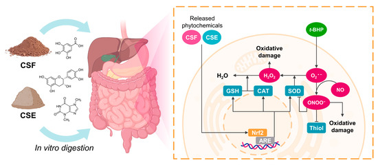 An illustrated diagram integrating the effects of the phytochemicals released from the CSF and the CSE during the simulated gastrointestinal digestion on the prevention of oxidative stress in intestinal and hepatic cells.