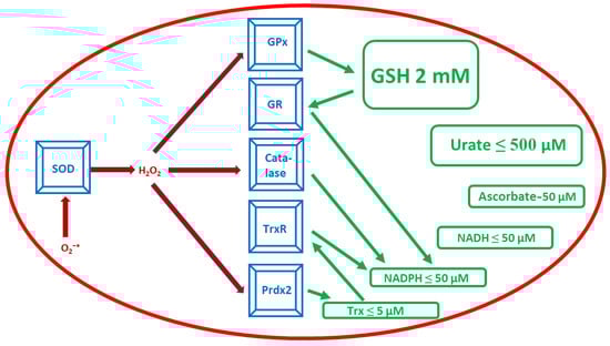 What makes the situation even worse is that mammalian erythrocytes, as cells devoid of nucleus and protein synthesis machinery, are unable to synthesize new proteins to replace damaged ones during their lifespan (120 days for human erythrocytes). Thus, erythrocytes must be well equipped with an efficient antioxidant and chaperone machinery [13,14]. The main non-enzymatic erythrocyte antioxidant in concentration terms is glutathione (GSH), which is present at a concentration of about 2 mM [15,16], much higher than uric acid/urate (50–500 μM) [17,18], ascorbate (about 50 μM) [19,20,21], NADH (≤50 μM), NADPH (5–40 μM) [22,23,24], and thioredoxin (Trx) (3–5 μM) [25,26] (Figure 1). The primary role in the removal of ROS is played by antioxidant enzymes. CuZn-superoxide dismutase (SOD1) dismutates superoxide, while H2O2 was long believed to be disposed of only by catalase and glutathione peroxidase (GPx) [27,28]; it was debated which enzyme is more relevant for the decomposition of physiological levels of H2O2 [29,30]. This well-established picture was changed completely by the discovery of an antioxidant function of a relatively abundant erythrocyte protein.