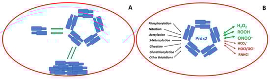 Prdx2 in erythrocyte: structure, substrates, and post-translational modifications (presented in Section 3, Section 4 and Section 5). Prdx2 is active as non-covalent dimers, which may form decamers and interact with the erythrocyte membrane (A). Prdx2 interacts with a range of substrates and under physiological conditions is the main enzyme removing some of them (indicated in green). Within the cell, it is subject to several post-translational modifications (B).