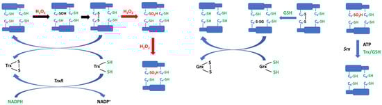 Instead of the Trx system, recycling may be performed by using GSH and glutaredoxin. CP-SOH and CP-SS-CR can also react with GSH to form a mixed disulfide that is reduced by glutaredoxin [55,56]. These two systems can complement each other; e.g., in red blood cells, TrxR activity is low [14], and GSH/glutaredoxin could bear the burden of Prdx recycling of the Trx system [56] (Figure 3).