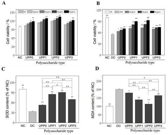 Cytotoxicity of UPPs (A) and changes in cell viability (B), intracellular SOD (C), and MDA (D) levels of UPPs before and after repair of damaged HK-2 cells. NC: normal control group, DC: damage control group, injured with 2.8 mmol/L oxalate solution for 3 h; polysaccharide concentration: 60 μg/mL; repair time: 12 h. * p < 0.05, ** p < 0.01 compared with DC group; # p <0.05, ## p < 0.01 compared between the different UPP treatment groups.