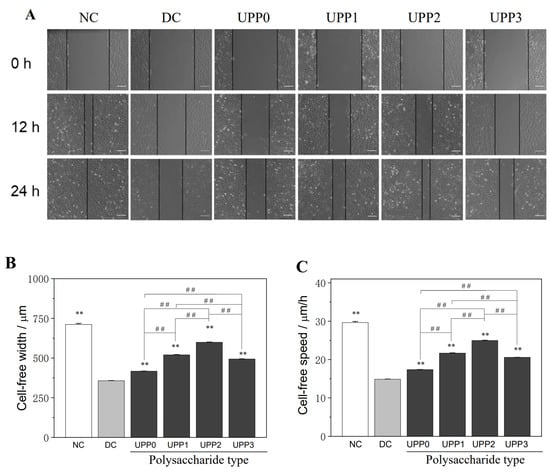 Changes in the cell healing ability of UPPs before and after the repair of damaged HK-2 cells. (A) Cell healing observed by ordinary microscope; (B) histogram of cell healing width within 24 h; (C) histogram of cell healing rate within 24 h. ** p < 0.01 compared with the DC group; ## p <0.01 compared between the different UPP treatment groups. Scale bar: 150 µm.
