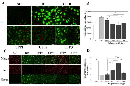 Fluorescence intensity graph (A) and semi-quantitative histogram (B) of ROS release by UPPs before and after the repair of damaged HK-2 cells, and fluorescence intensity graph (C) and semi-quantitative histogram (D) of mitochondrial membrane potential. NC: normal control group, DC: damage control group, injured with 2.8 mmol/L oxalate solution for 3 h; polysaccharide concentration: 60 μg/mL; repair time: 12 h. Scale bar: 150 µm. * p < 0.05, ** p < 0.01 compared with the DC group; # p <0.05, ## p <0.01 compared between the different UPP treatment groups.
