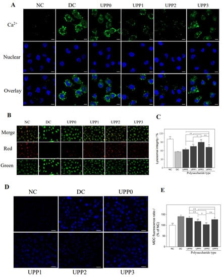 Changes of the intracellular Ca2+ level (A), lysosomal integrity (B,C), and autophagy activity (D,E) before and after the repair of damaged HK-2 cells by UPPs. Intracellular Ca2+ was stained with Fluo-4 AM (red-green fluorescence); nuclei were stained with DAPI (blue fluorescence). NC: normal control group, DC: damage control group, injured with 2.8 mmol/L oxalate solution for 3 h; polysaccharide concentration: 60 μg/mL; repair time: 12 h. Scale bar: (A) 10 µm, (B) and (D)50 µm. * p < 0.05, ** p < 0.01 compared with DC group; # p <0.05, ## p <0.01 compared between the different UPP treatment groups.