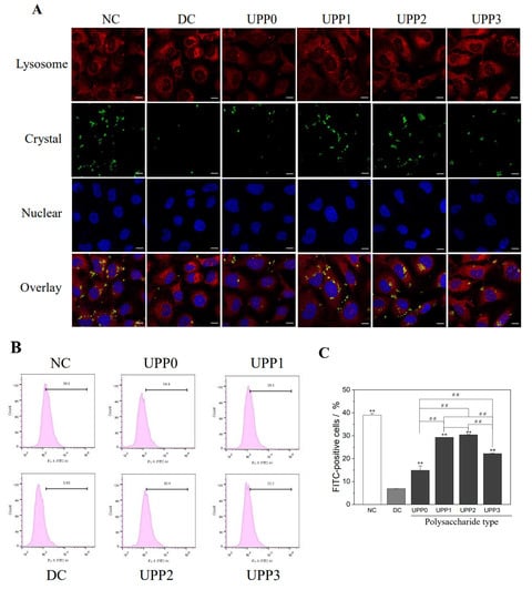 Acridine orange (AO) can bind to acid hydrolase in lysosomes and emit orange–red fluorescence, whereas it emits green fluorescence in the cytoplasm []. As shown in Figure 5B, the lysosomal structure of the normal control group was relatively complete, and the superposition of red fluorescence and green fluorescence showed more orange–red fluorescence. However, the red fluorescence of cells in the damage group were significantly reduced, and the integrity of lysosomes dropped to 55.92% (Figure 5C). Once repaired by UPPs, the integrity of lysosomes increased to 63.74–89.01%, of which UPP2 showed the best repair effect.