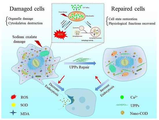 When the cells are damaged, the intracellular cleaner (lysosomes) and energy-supplying organelle (mitochondria) are damaged to varying degrees, and the cytoskeleton is damaged. The cell is in poor condition, resulting in weak endocytosis. Once repaired by UPPs, the mitochondrial membrane potential of the damaged cells recovered to close to normal cellular levels (Figure 4C). Lysosomal integrity was also improved (Figure 5B), and the cytoskeleton was restored (Figure 2B), thereby providing conditions for endocytic crystals. Therefore, the amount of endocytosed crystals in the UPP repair group increased, particularly the UPP2 repair group, because of its best cell state. The amount of crystal endocytosis was the highest, which was close to the normal control group (Figure 7). Therefore, UPPs can improve the ability of cells to take up nano−COD by repairing oxidatively damaged renal epithelial cells, including repairing mitochondria, lysosomes, and restoring the cytoskeleton, thereby reducing the risk of stone formation. The mechanism is shown in Figure 8.