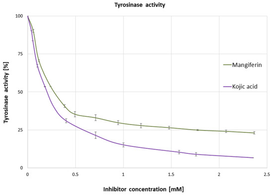 Changes in the activity of tyrosinase (%) in the presence of increasing concentrations of mangiferin and kojic acid (mM). The results were obtained from three independent experiments, in three replicates (n = 9). Error bars represent standard deviations.