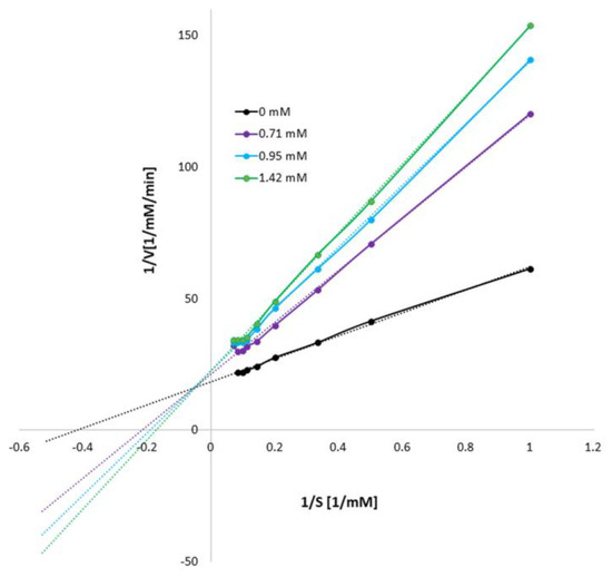 The Lineweaver–Burk plots were constructed and analysed to estimate the type of inhibition process between mangiferin (0, 0.71, 0.95, and 1.42 mM) and tyrosinase.