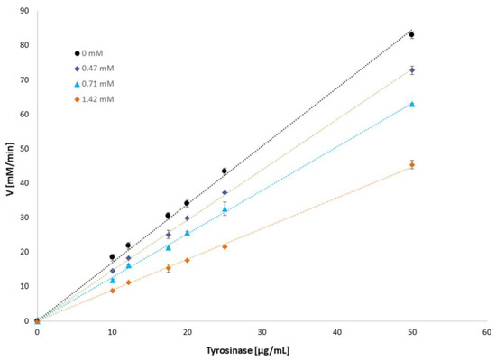 L-DOPA oxidation velocity [mM/min] dependence on tyrosinase concentration [µg/mL] in the presence of mangiferin (0 mM, 0.71 mM, 0.95 mM, 1.42 mM).