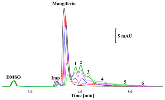 The CE analysis of (black trace) mangiferin solution in 50 mM phosphate buffer (pH 6.8) and its mixture with tyrosinase at the concentration of (red trace) 0.025 mg mL−1, (blue trace) 0.05 mg mL−1, (violet trace) 0.1 mg mL−1, (dark green) 0.15 mg mL−1, and (light green) 0.2 mg mL−1. The mangiferin concentration was constant in all solutions (0.3 mg mL−1). Imp—mangiferin impurity; the numbers indicate certain complexes of mangiferin with the enzyme.