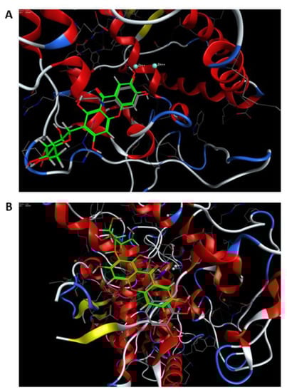 (A) The final pose of mangiferin (ligand highlighted in green) superposed with the original conformation of L−DOPA (ligand highlighted in gray) at the active site of tyrosinase (PDB ID: 4P6S). (B) The peripheral site of tyrosinase (PDB ID: 4P6S).
