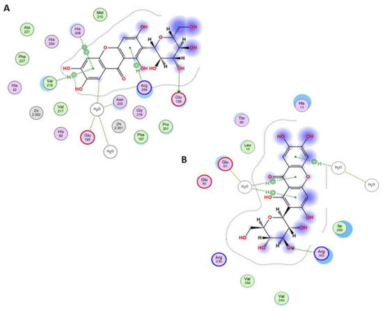 On the basis of these results, we propose that both sites, namely, the active center and the peripheral site, can be occupied by mangiferin similarly to the L-DOPA molecule. Furthermore, both molecules can interact identically with the surrounding amino acid residues (Figure 6, Figure 7 and Figure 8).