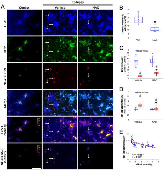 3.1. NAC Restores GPx1 Expression and Inhibits CK2-Mediated NF-κB S529 Phosphorylation in Clasmatodendritic CA1 Astrocytes