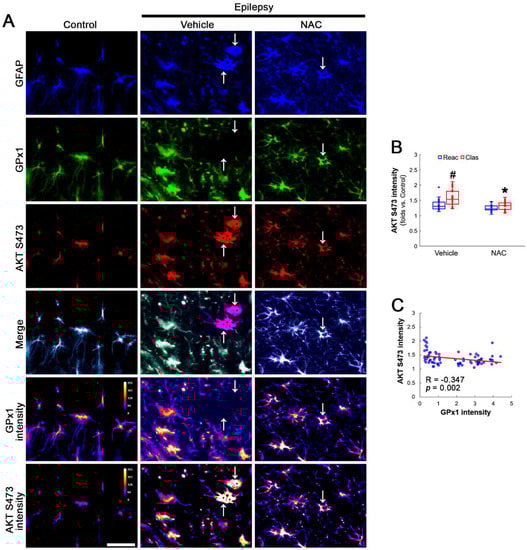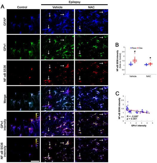3.2. NAC Diminished AKT-Mediated NF-κB S536 Phosphorylation in Clasmatodendritic CA1 Astrocytes