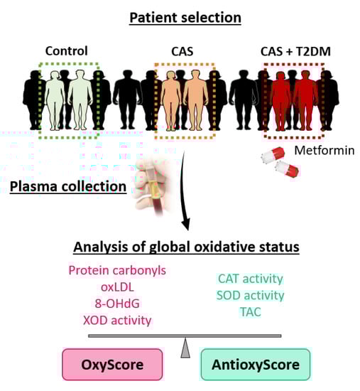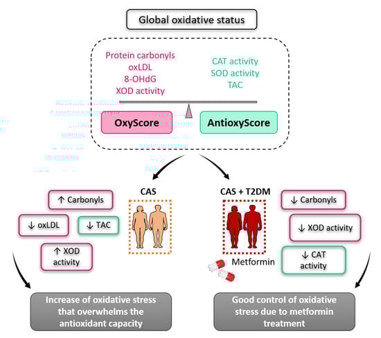 Although several studies have demonstrated that oxidative stress plays important roles in the progression of CAS and T2DM individually, the global oxidative status of patients with both of these pathologies has yet to be evaluated. Moreover, the effect of metformin on oxidative stress has not been assessed in the context of CAS. Here, we adopted a multimarker approach to examine the global oxidative status of CAS patients, both with and without T2DM.