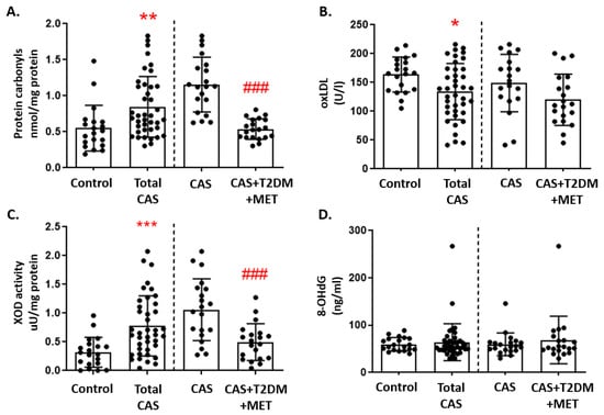 Markers of oxidative damage in CAS patients with and without T2DM: (A) Protein carbonyls, (B) oxidized LDL (oxLDL), (C) xanthine oxidase (XOD) activity, and (D) 8-hydroxy-2’-deoxyguanosine (8-OHdG) are represented as the mean ± SD. All of the graphs show the comparison between control subjects and total CAS patients (including CAS with T2DM and metformin treatment), and that between the CAS patients with and without T2DM, separated by a discontinuous line; * p < 0.05, ** p < 0.01, *** p < 0.001 control subjects vs. total CAS; ### p < 0.001 CAS vs. CAS + T2DM + MET.