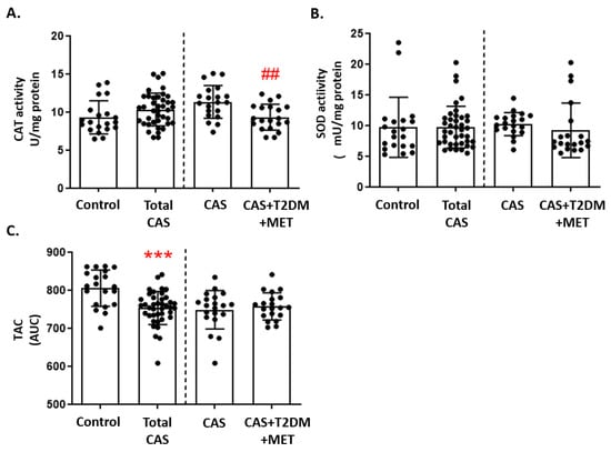 Markers of antioxidant defense in CAS patients with and without T2DM: (A) Catalase (CAT) activity, (B) superoxide dismutase (SOD) activity, and (C) total antioxidant capacity (TAC), quantified as the area under curve (AUC), are represented as the mean ± SD. The graphs show the comparison between the healthy control subjects and the total CAS patients (including CAS with T2DM and metformin treatment), and between CAS patients with and without T2DM, separated by a discontinuous line; *** p < 0.001 healthy control subjects vs. total CAS; ## p < 0.01 CAS vs. CAS + T2DM. MET: metformin.