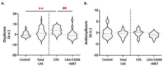 Variations in the (A) OxyScore and (B) AntioxyScore of CAS patients with and without T2DM. The graphs show the comparison between the control subjects and all of the patients with CAS (including CAS with T2DM and metformin treatment), and between CAS patients with and without T2DM, separated by a discontinuous line; ** p < 0.01 control subjects vs. CAS; ## p < 0.01 CAS vs. CAS + T2DM + MET. MET: metformin.