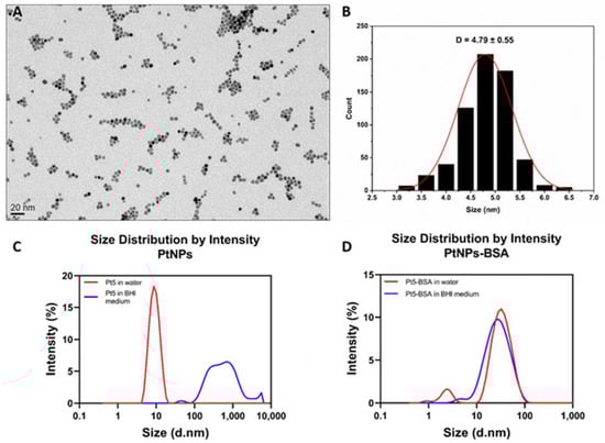 Characterization of synthesized nanoparticles and their stability in BHI medium. Representative TEM image (A) and relative size distribution analysis (B). DLS spectra of (C) 5 nm platinum nanoparticles and (D) 5 nm platinum nanoparticles coated with BSA, both dissolved in water (red curves) and BHI medium (blue curves). PtNPs alone are stable and monodispersed in water, but they aggregate when added to BHI medium (C). Conversely, PtNPs-BSA show a similar peak when dissolved in water and in BHI medium ((D), centered at around 30 nm), confirming the stability ensured by BSA-coating.