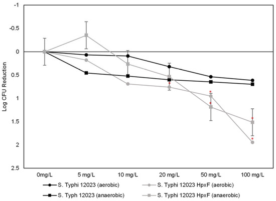 It has been reported that PtNPs have outstanding catalytic activity and exhibit typical kinetics of oxidases [,]. Interestingly, Song and colleagues reported that PtNPs coupled on deposited Multiwalled Carbon Nanotubes presented oxidase activity generating superoxide O2•−, from dissolved O2 []. In fact, this catalytic activity mimics one of the best-characterized sources of ROS during host cell–pathogen interactions, namely the NADPH oxidase []. The accumulation of superoxide causes bacterial membrane lipid peroxidation, which increases the cell permeability causing the uncontrolled transport of intra- and extracellular molecules, finally leading to cell death []. Our data indicate that the strain 12023 HpxF-, with impaired response to oxidative stress, is significantly more susceptible than its parental strain. The combined effect of Salmonella Typhimurium ROS defence enzymes such as alkyl hydroperoxide reductases AhpCF, TsaA and catalases KatE, KatG and KatN enables possibility of two types of scavenging systems that contribute to oxidative stress survival. Hence, while catalases act as the first line of oxidative stress defence by scavenging H2O2, alkyl hydroperoxide reductases eliminate micromolar concentrations of H2O2 and other hydroperoxides []. These reductases are part of peroxiredoxins, which reduce organic hydroperoxides to alcohols and hydrogen peroxide to water at the expense of NADH or NADPH []. Additionally, Hébard and colleagues (2009) showed that S. Typhimurium Kat- mutants (ΔkatE ΔkatG ΔkatN) and reductase Ahp- mutants (ΔahpCF ΔtsaA) were still able to scavenge H2O2 due to the compensatory regulation of the other enzymes []. Previous studies have shown similar results with Salmonella enterica ser. Infantis exposed to 50 mg/L of PtNPs had a reduction of 1 Log CFU [].