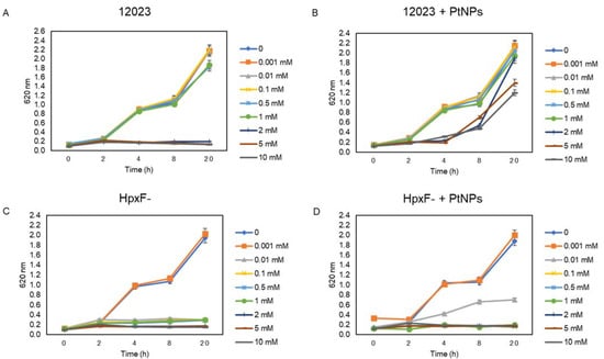 Exposure of S. Typhimurium parental strain 12023 to millimolar concentrations of H2O2 only (A) and in combination with 10 µg/mL PtNPs (B); and exposure of mutant strain 12023 HpxF- to millimolar concentrations of H2O2 only (C) and in combination with 10 µg/mL PtNPs (D).