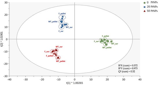 Orthogonal Projections to Latent Structures Discriminant Analysis (OPLS-DA) score plot based on the metabolomic profile of treated and untreated supernatant and cells of parental strain 12023 and mutant strain 12023 HpxF-. The exposure was carried out with 0 mg/L (green), 20 mg/L (blue) and 50 mg/L (red) of PtNPs. WT_sur: parental strain supernatant sample; WT_pellet: parental strain cell sample; F_sur: mutant strain supernatant sample; F_pellet: mutant strain cell sample.